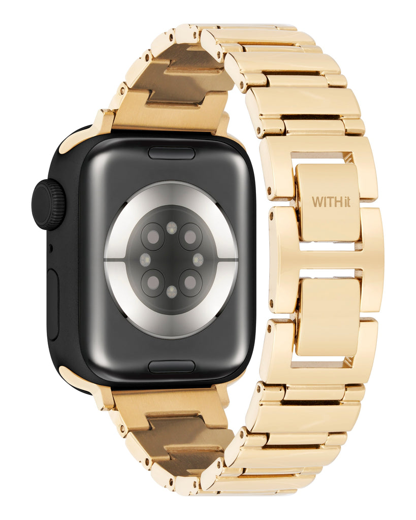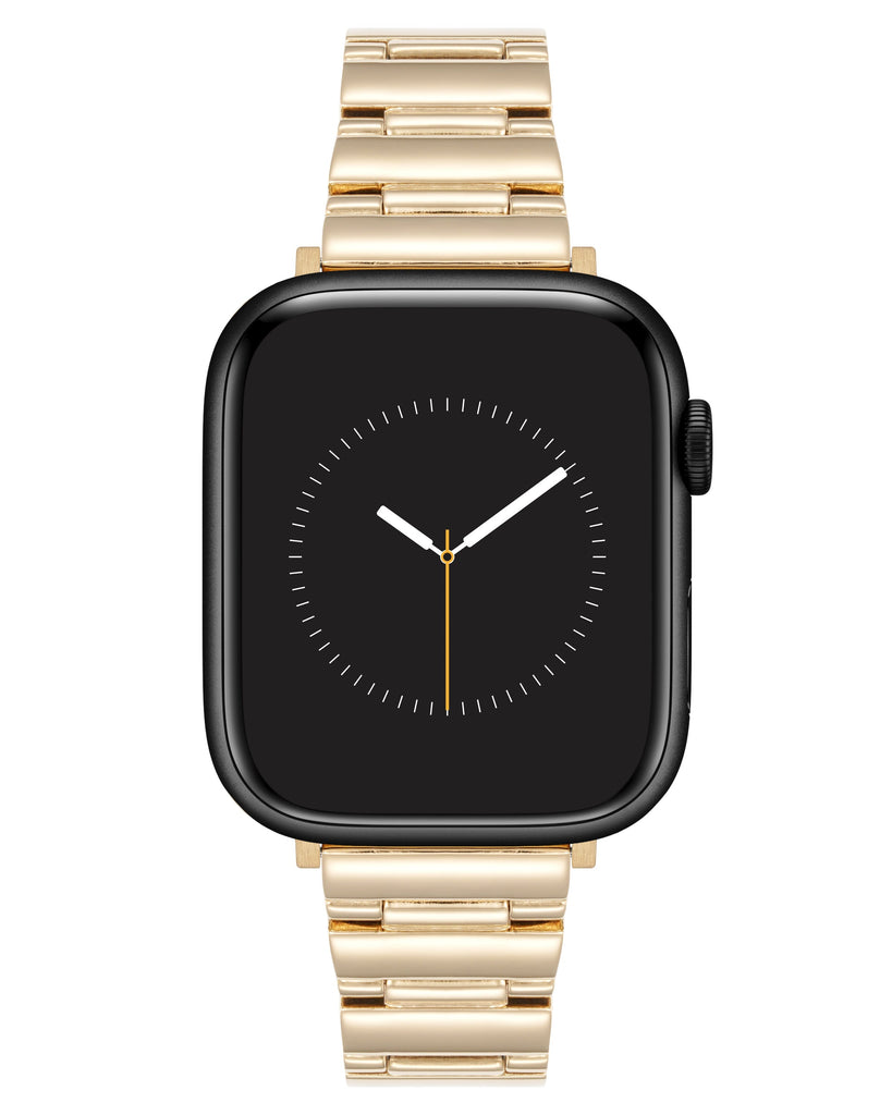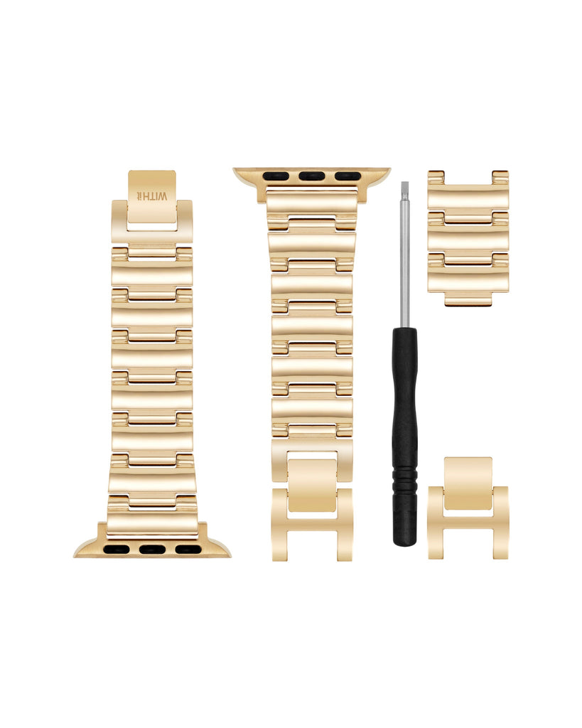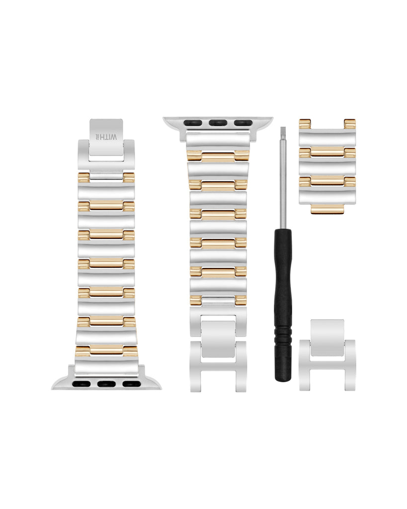 Crafted from durable stainless steel with sleek gold ionic plating, the Straight Edge Link Band offers a high-polish finish for a sophisticated look. Designed for the Apple Watch, it includes easy-to-remove extenders and extra links, allowing you to customize the fit easily. The steel screw pins and included screwdriver tool make link adjustments simple and secure. A perfect balance of elegance and practicality, this gold-tone or gold and silver two-tone band brings style and functionality to your Apple Watch.