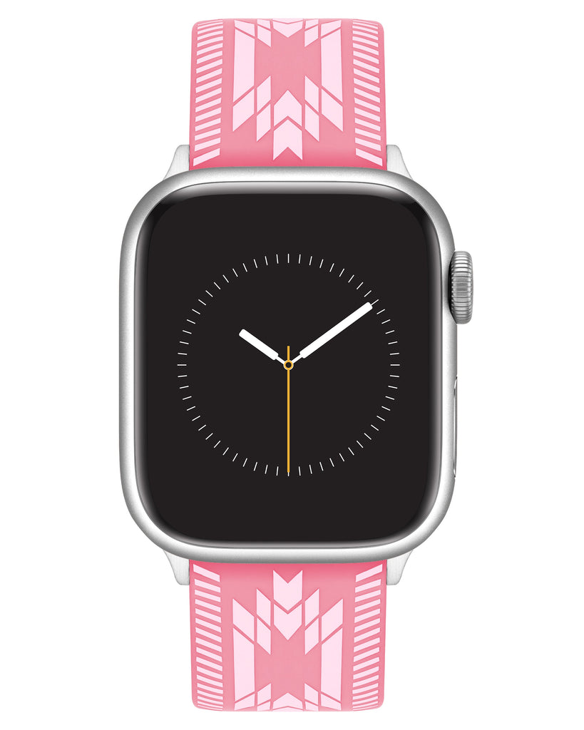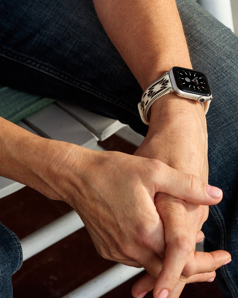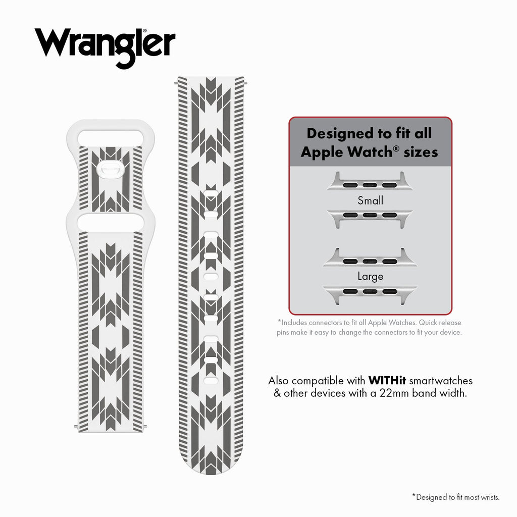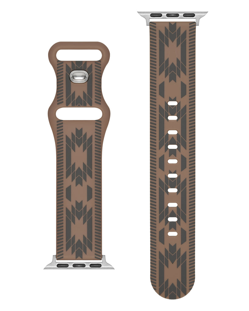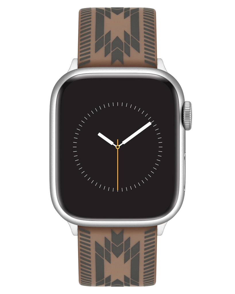 Enhance your Apple Watch with a rugged Western flair with Wrangler’s two-tone brown silicone, cream and brown silicone, two-tone blue silicone, pink silicone, or light pink silicone Aztec pattern band. Inspired by classic Western design, the intricate geometric details create a distinctive look while ensuring the flexibility and comfort that silicone offers. This band combines durability with striking style and is universally compatible with all Apple Watch devices, making it the perfect companion for everyday adventures.