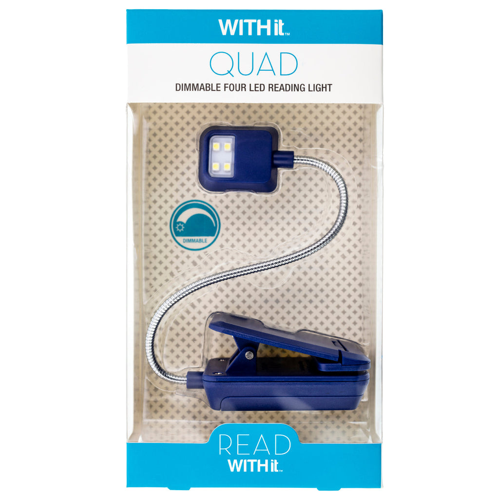 Illuminate your reading with the Quad 4 LED Reading Light. This versatile reading and task light is your perfect partner for relaxing with a good book or immersing yourself in important documents. Its user-friendly hinged clip securely attaches to your reading material, and the flexible gooseneck provides customizable lighting angles and full-range dimming for maximum convenience.