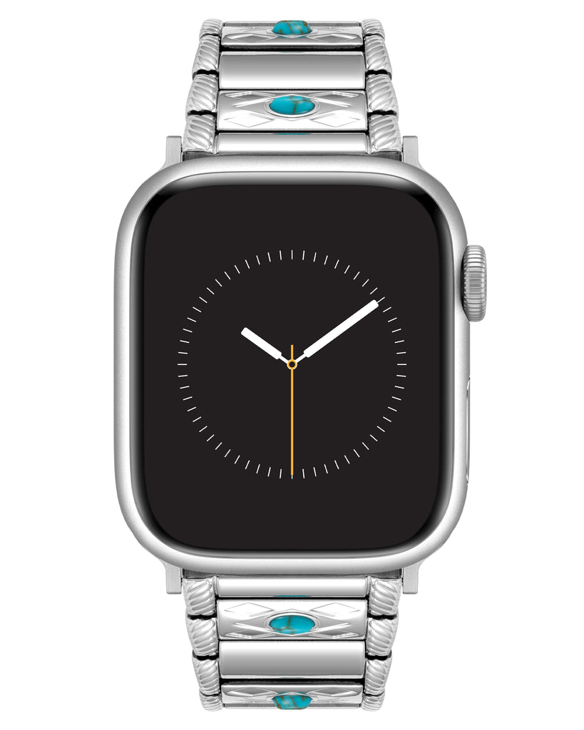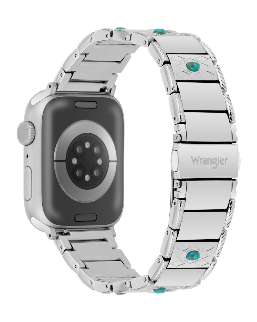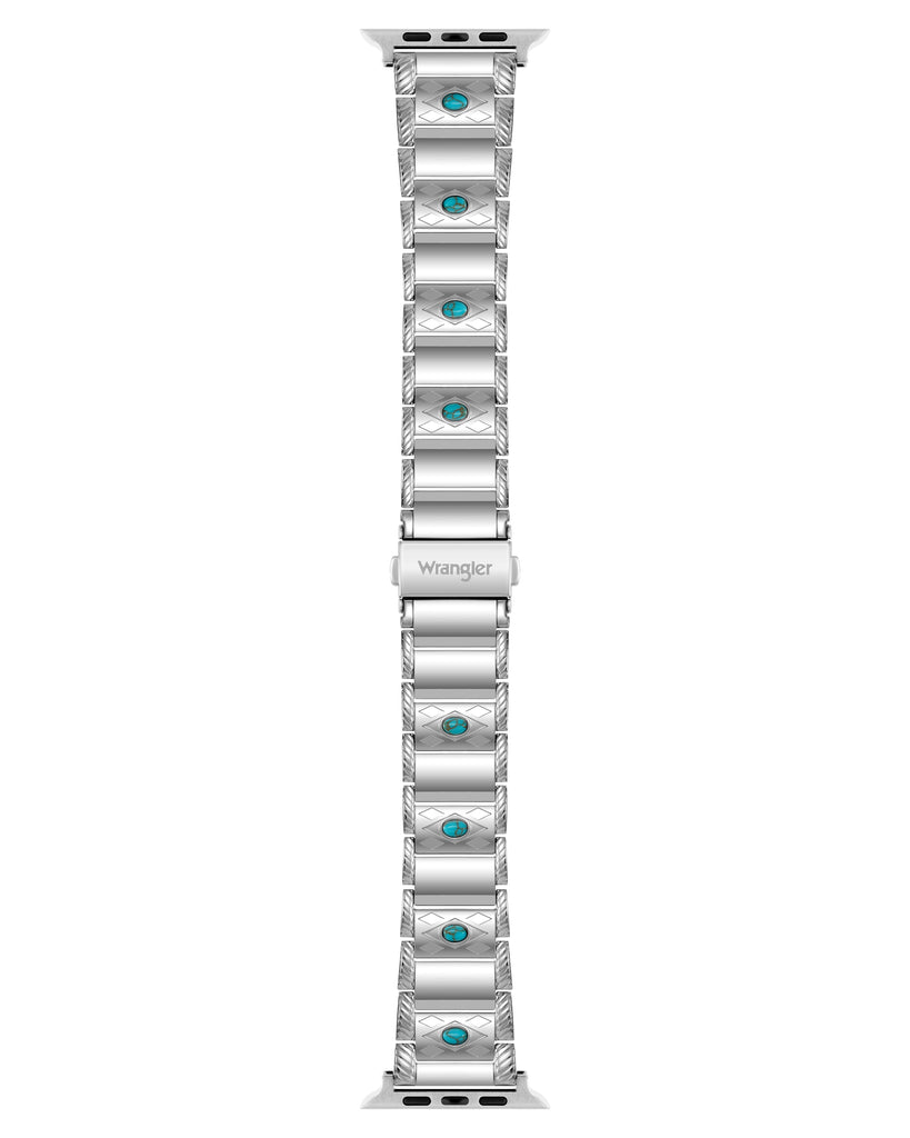 Make a statement that’s equal parts rugged and refined with the Turquoise Trail Alloy Link Bracelet. This polished, adjustable bracelet showcases ten turquoise stones set into textured center links, evoking Wrangler’s heritage of Southwestern style. Crafted with shiny stainless steel and a secure double-button fold-over buckle, this bracelet delivers a distinctive Western look that’s built to last.
