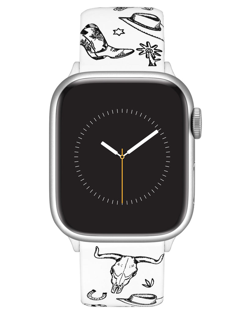 Add a touch of western flair to your everyday look with the Wrangler® “Trail Sketch” Silicone Band for Apple Watch®. Designed with iconic desert-inspired motifs, this durable band blends classic Wrangler® style with modern function. Its smooth silicone finish feels soft against your skin, while the keeperless closure ensures a secure, adjustable fit through every ride, run, and routine.